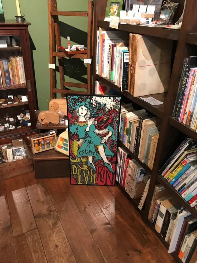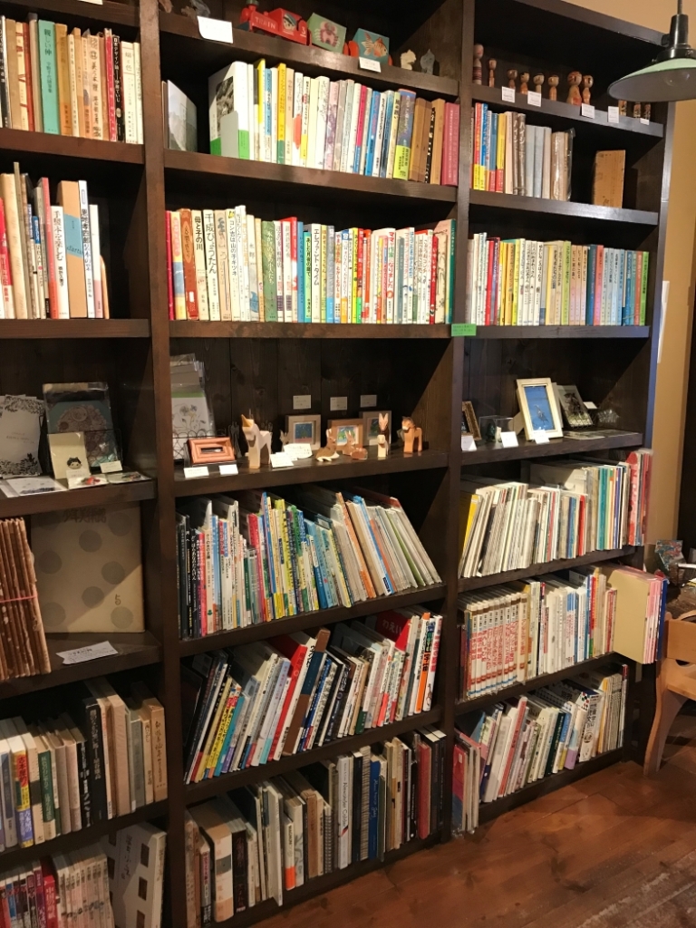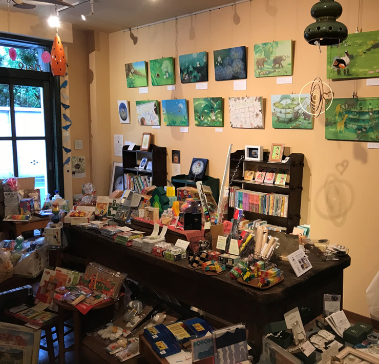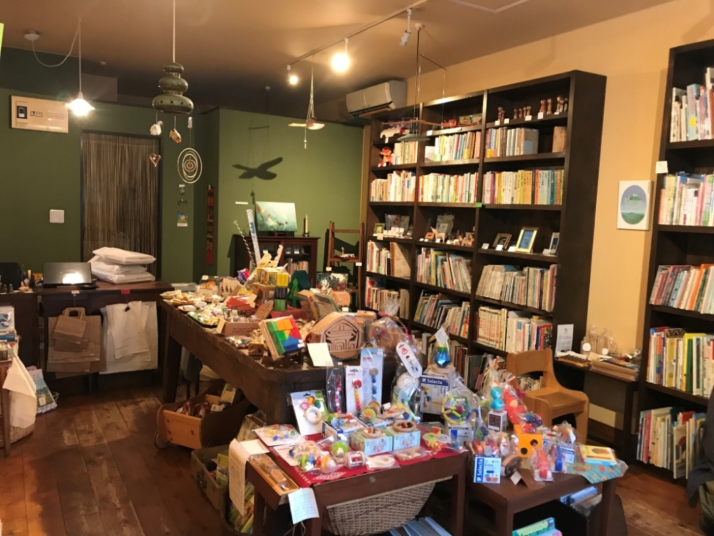 一進門中央的大桌子上擺滿了琳瑯滿目的木頭玩具,主要都是從德國進口。右邊則有兩個大書架,左邊也有小桌子陳列雜貨,牆上一小區是展示原畫的空間。當時展出的是丸山綾子的《蒲公英之船》(たんぽぽのふね)。店長曾經在幼兒教育出版物及玩具的公司任職,在這個書店內收集了她自己喜歡的東西,希望打造一個不管大人小孩都能「自得其樂」的空間。