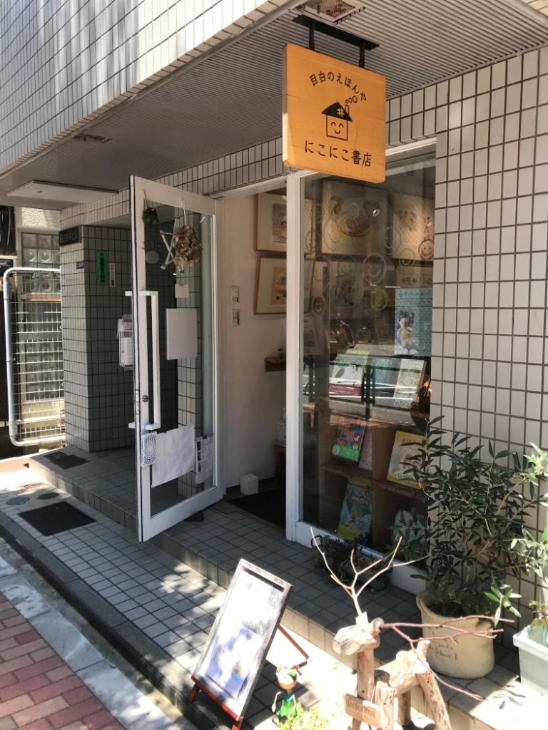 另一間目白的獨立小書店叫做「目白のえほんや にこにこ書店」(目白的繪本店 微笑書店),從目白車站步行約要15分鐘。店長之前擔任幼稚園老師、托兒所保育員十年,也曾在二手繪本店上班,於2019年開業。這間店應該是我逛過最小的書店,目測大概兩坪。右邊是書櫃,左邊是原畫展示牆。