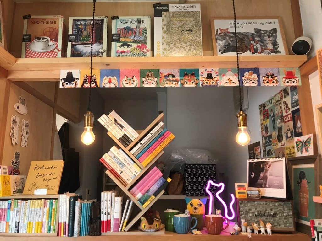 推門進入,眼前琳瑯滿目的貓咪書籍與雜貨幾乎佔據了所有空間,讓一樓的空間顯得有些侷促。左手邊是一個向內凹的空間,店長運用了家具及各種大小的書櫃、木框佈置成讓人駐足不前的小展廳。這些雜貨原先也都是店長本身的收藏,為了開店再去批發而來。