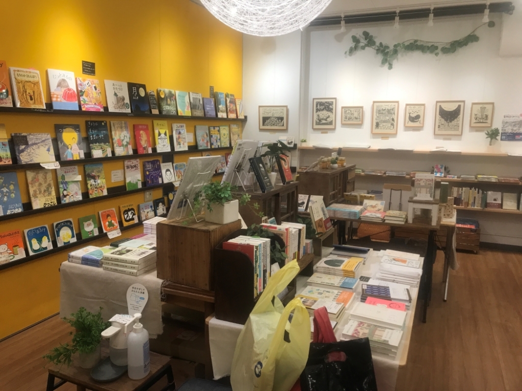 走近店內首先映入眼簾的是兩張大展示桌,童書與生活類的書籍約各佔一半。兩側的牆壁上掛著原畫,還有一整面繪本書牆。原本打算買村田惠美子的繪本,她有一本《下一站下車》(つぎ、とまります)我非常喜歡,但仔細看了其他本似乎又沒有特別喜歡的。我在店裡繞了好幾圈,還跟店長要了剛出版三天,還來不及上架的麵包小偷最新續集,看完之後還是覺得第一本最好看。最後買了一本MOE雜誌封面的刺繡繪本,買完之後終於敢跟店長問能不能拍照了,本來差點要買寄售的山梨縣水果罐頭呢。
