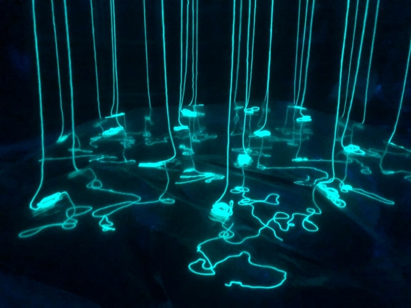 螢色的細線,彎彎曲曲的,好像麵線、好像外星人的繩索…還像什麼呢?在漆黑的展場裡,觀眾有8分鐘的時間可以仔細觀察這些繩子,像什麼?又帶給你怎樣的感受呢?這些細繩隨著透明袋子的膨脹與收縮,改變了蜷曲的位置,讓作品好像真的「飄浮」起來了呢!