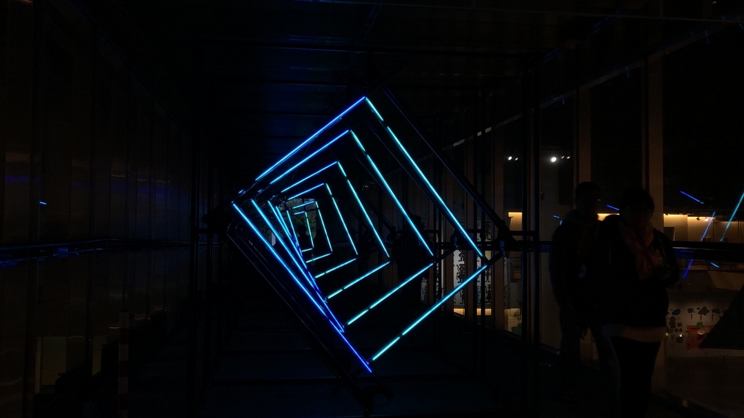 空橋上的長廊中,串起了一個個方塊,隨著方塊的放大和縮小,以及顏色的改變和旋轉,彷彿能透過它穿越到遙遠的國度!