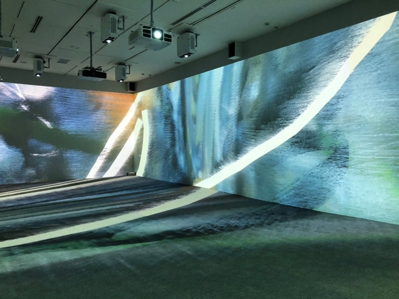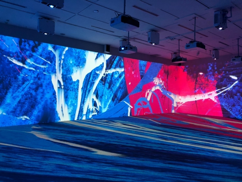 來到美術館的201展演廳,進入沉浸式的展演空間,觀眾可以坐在這裡慢慢欣賞空間與光影的變動。這些投影是什麼呢?是藝術家將繪畫作品,拼湊、整合在四面牆與地板上,彷彿進入到畫作裡,成為畫作的一部份!當我們走出作品後,回頭一看,也有很不一樣的視覺體驗唷!