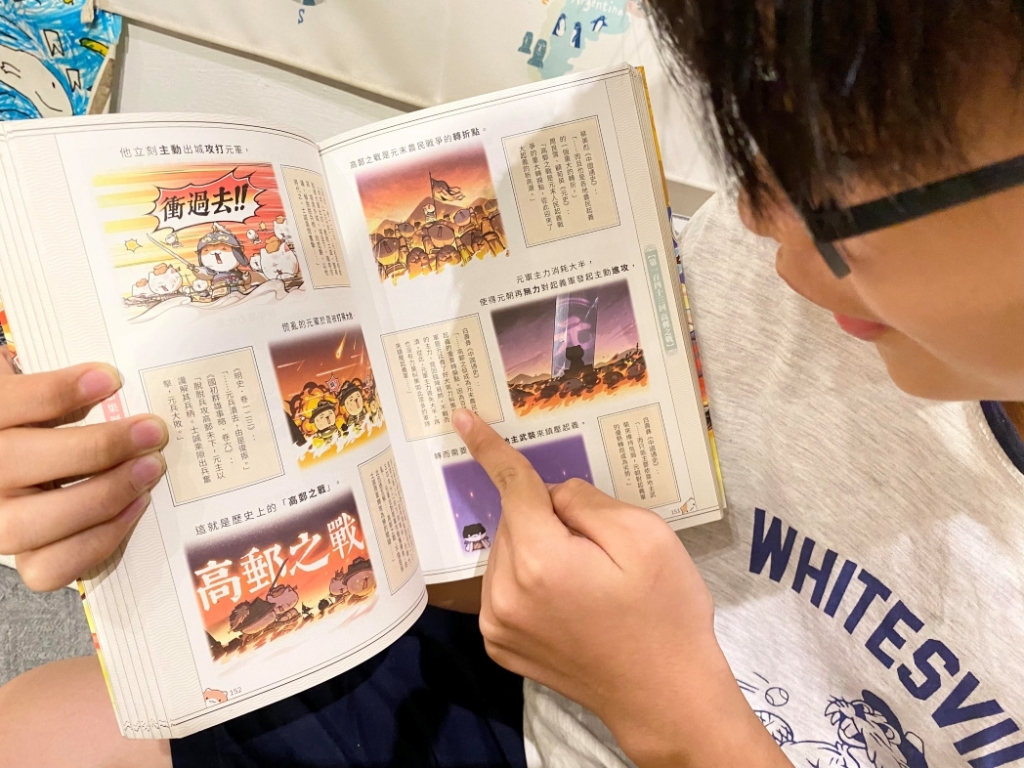 不需要考試和寫功課,只把歷史當作故事來讀其實是很快樂的一件事,我和同學在學校很喜歡讀《如果歷史是一群喵》這個系列,因為歷史人物都化身為貓,對我這個不太喜歡看人物漫畫的愛貓人士來說真是太棒了!我喜歡書裡長得很像徽徽的「瓜子」,當他飾演唐太宗時,我讀得特別開心,也因此找了更多書來研究唐代歷史,除了貓中我意以外,它不是全部以比較幽默有趣的漫畫敘事,會在圖文說故事之間放入史書的原文摘錄,讓我們不光是看貓咪打鬧搞笑,還可以知道他們表現的事件是出自哪部分的史實,我覺得小朋友用這樣的書來開始研究歷史會比較輕鬆,期待以後也能看到台灣或是世界的歷史故事也會有這樣的表現方式。