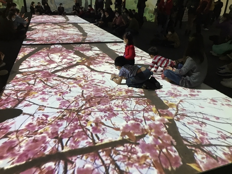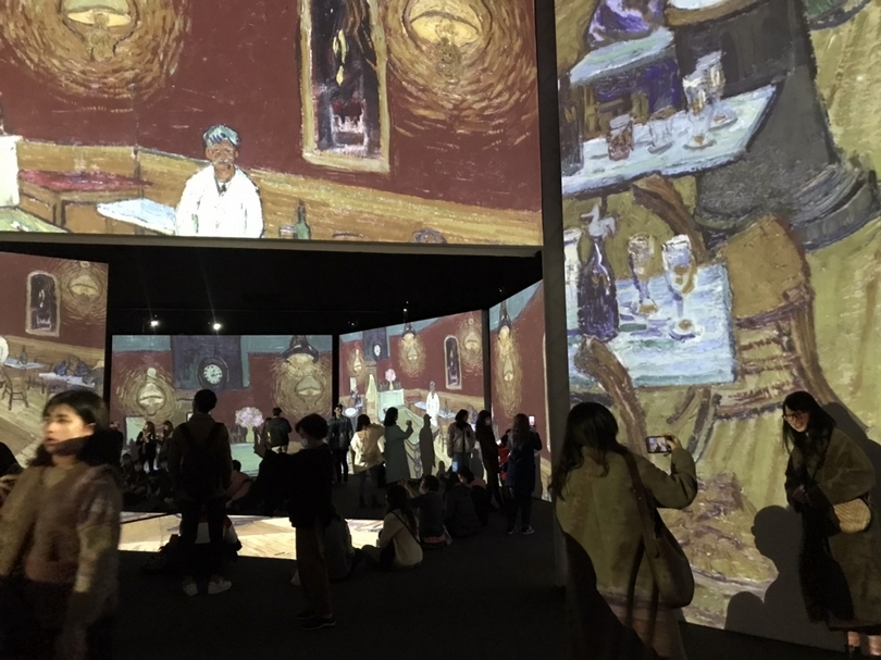 隨著梵谷不同時期的畫作不斷在螢幕上流動,畫作不再是在美術館的展覽方式。在展區裡的觀眾們或坐或站,把自己丟進梵谷世界裡的顏色裡面,用最舒適的方式跟角度去欣賞。在流動的畫作跟古典音樂裡,隨著梵谷的創作生涯演進,遊歷荷蘭、亞爾、聖雷米和奧維小鎮。