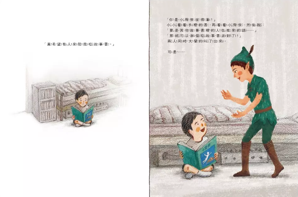 可是,推廣親子共讀約莫十五年的時間,發現「共讀」這件事在忙碌的雙薪家庭中要落實,也有著某些程度上的挑戰!這個故事正點出了這樣的情境,男孩拿著故事《小飛俠》希望爸爸媽媽可以陪伴唸讀故事,可惜他們都在忙,小男孩孤單的把書打開,沒想到彼得潘出現了!提議來一場故事派對,可是小紅帽、三隻小豬、長髮公主都沒有空,這該怎麼辦才好呢?……到底會不會有誰可以來陪男孩讀故事呢?!