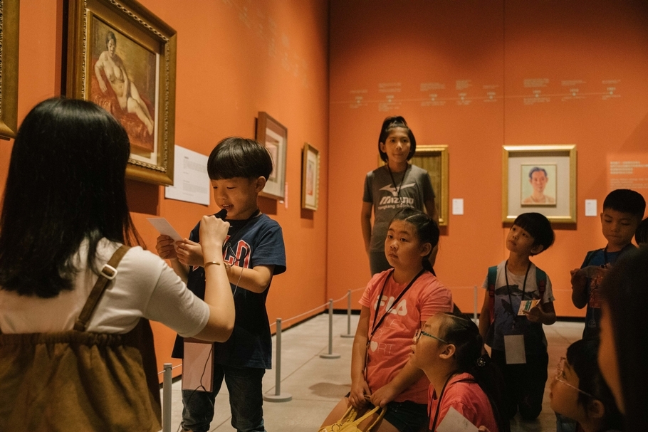 工作坊亦會帶領小朋友到展間聆聽導覽學習(圖片來源:臺南市美術館;攝影:林睿洋)