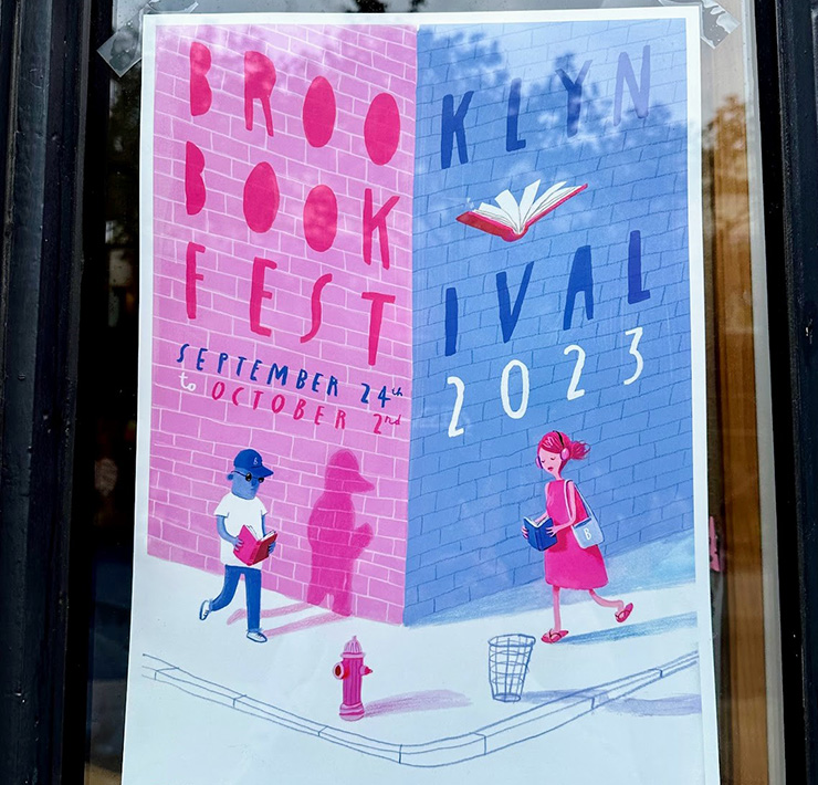 2023年圖書節的主視覺是知名繪本創作者奧立佛.傑法(Oliver Jeffers)的畫作,在布魯克林的書店都可以看到這張吸睛的海報。圖書節的現場可以免費拿取以這張圖做封面的報紙節目表,由於同時間有許多的活動在進行,參加者可以先研究一下最想出席的活動有哪些,再根據時間表和地圖前往活動場地。
