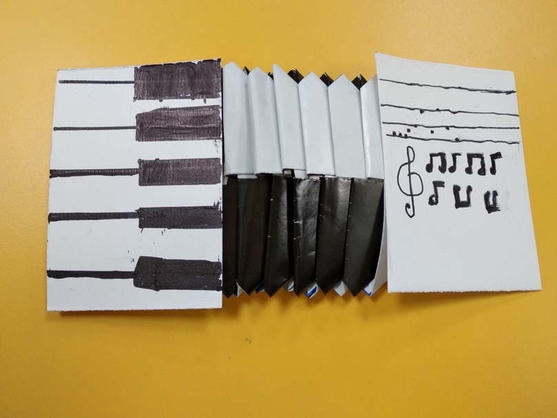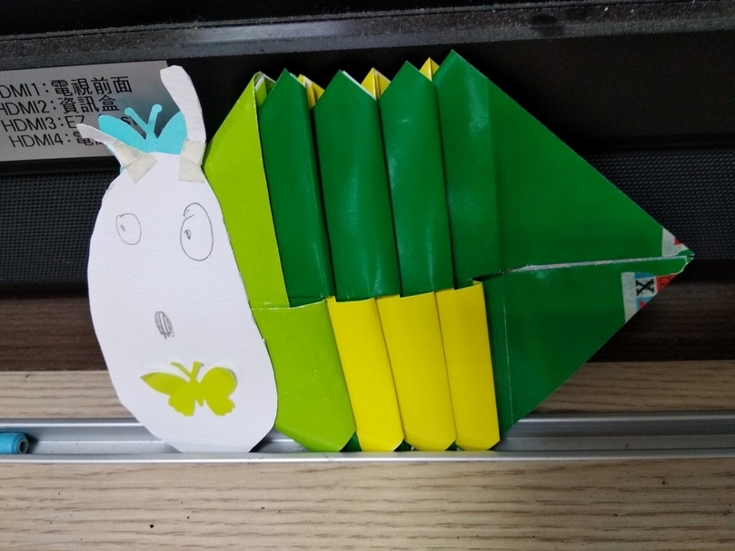 最近因為恰巧看到王淑芬老師在臉書上大方分享會動的毛毛蟲作法,覺得這隻毛毛蟲適合拿來說故事,當成課程開始前的引起動機很不錯,果然學生們馬上被吸引,擠到我面前來和毛毛蟲互動,還編出了許多劇情。但因為有學生說毛毛蟲好噁心,想做些別的,順勢和學生進行討論,除了毛毛蟲我們還能做些什麼呢?開始有學生比手畫腳的說「手風琴」、「101大樓」、「鐵捲門」、「百葉窗」、「拉門」、「魚」、「蛇」……所以下方分享了手風琴及毛毛蟲作品的照片。