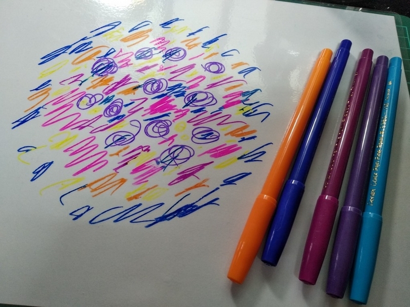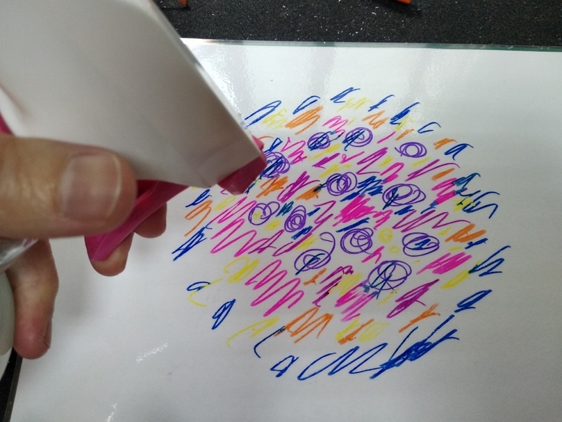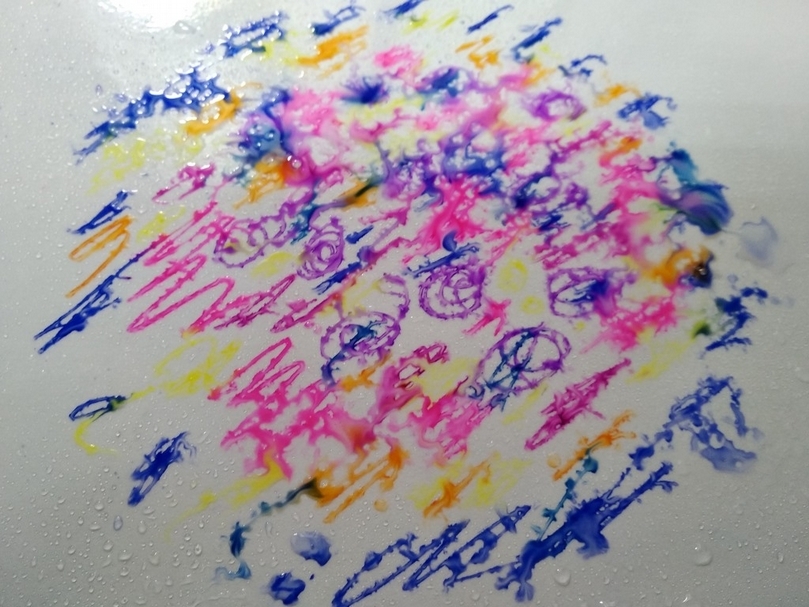利用彩色筆將數個顏色畫在壓克力版上,噴上水後,拿出備好的水彩紙或宣紙(實驗證明,能吸水的紙張效果最好)覆蓋後即完成,完成後的作品很夢幻,可以當成背景繼續創作,拿來畫纏繞畫也很不錯的。