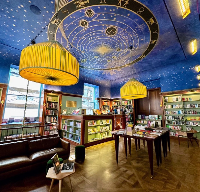 這個小王子坐在牆上抬頭仰望天空的銅像,就在法國大使館的文化服務中心Villa Albertine旁邊,而這棟白色的百年建築裡,有間美麗的法文書店 Albertine Books。書店二樓的天花板是美麗的藍色星空與金色的星座圖案,搭配著黃色的吊燈,讓書店本身跟小王子的故事一樣夢幻。