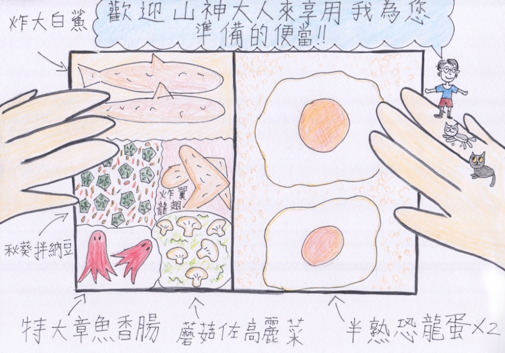 媽媽最先看到《山神大人的巨無霸便當》書稿時就驚呼:「這一定是闆寶的菜!」果然是世界上最瞭解我的人,光聽到書名我就點頭按十個讚,山神大人的便當能有多巨大?打開書每一頁都讓我瞠目結舌,竟然可以如此巨大化一個傳統日本風味的便當,要集結一整個村子的人來合力製作,從需要小朋友一人一粒搬運的大米粒、和長頸鹿脖子一樣長的竹輪到五百顆蛋做成的玉子燒,這麼誇張的便當工程,畫得這麼詳細認真,讓我一邊看一邊讚嘆,太佩服作者的想像力和幽默感了,這真的是把「搞怪日常」發揮得淋漓盡致的一本書,和我一樣愛吃便當也愛讀搞怪書的大人小孩一定不要錯過這本!