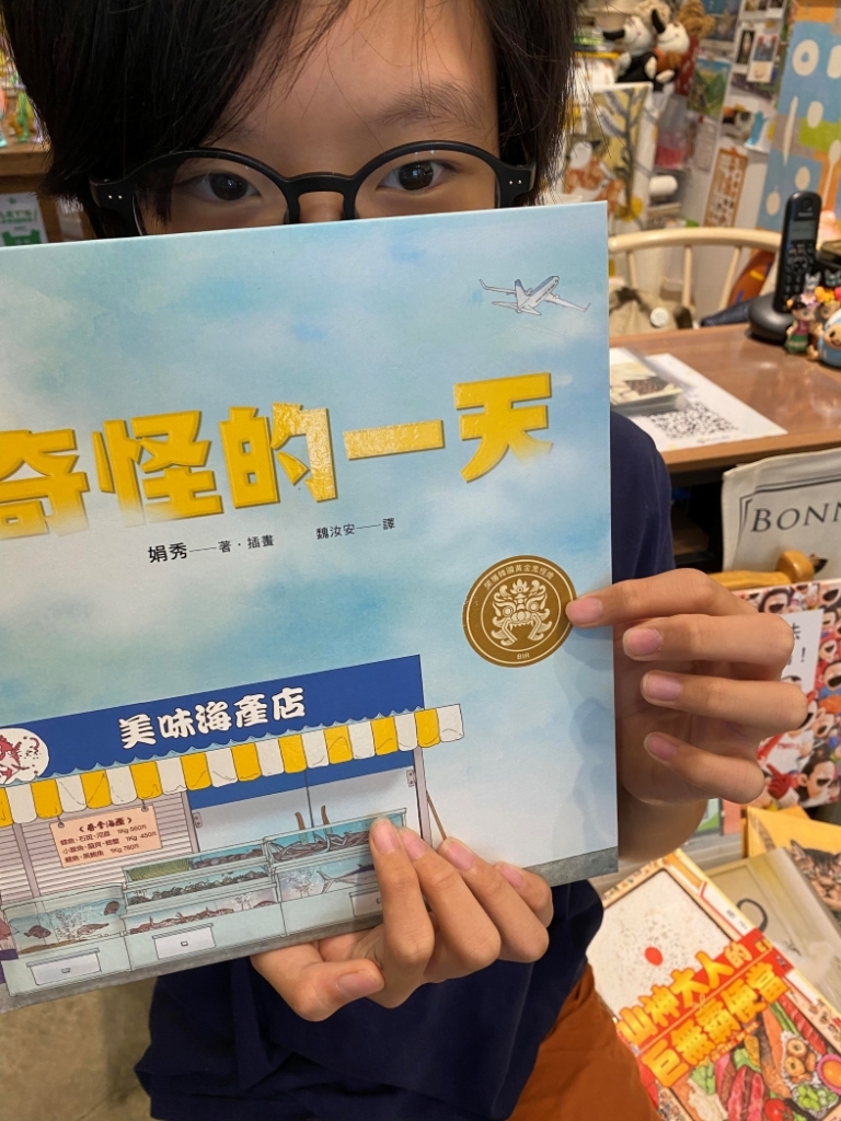 第一本我想說說《奇怪的一天》,第一次看到書的封面時,會覺得這哪裡奇怪啊,就是一家平常在台灣街頭也常常看得見的海產店,引起我好奇心的是書封上貼了「榮獲韓國黃金鬼怪獎」的貼紙,海產店的故事竟然可以得到鬼怪獎,這裡頭一定有什麼不對勁!翻開書發現暫時歇業的海產店門口水族箱裡,剛剛明明還在的魚和螃蟹都消失了,牠們「逃」出來了,漂浮在公園沙堆裡、草叢裡、水溝蓋上、石牆上,和小孩玩砂、和蝴蝶飛翔,在石牆上和貓咪「躲貓貓」,還和布穀鳥搶鳥巢空位,竟然都沒有被發現,牠們都是海洋生物啊,都是剛剛還在海產店水族箱裡的海鮮耶,畫風那麼寫實,情節卻如此奇幻,難怪能獲得鬼怪獎!