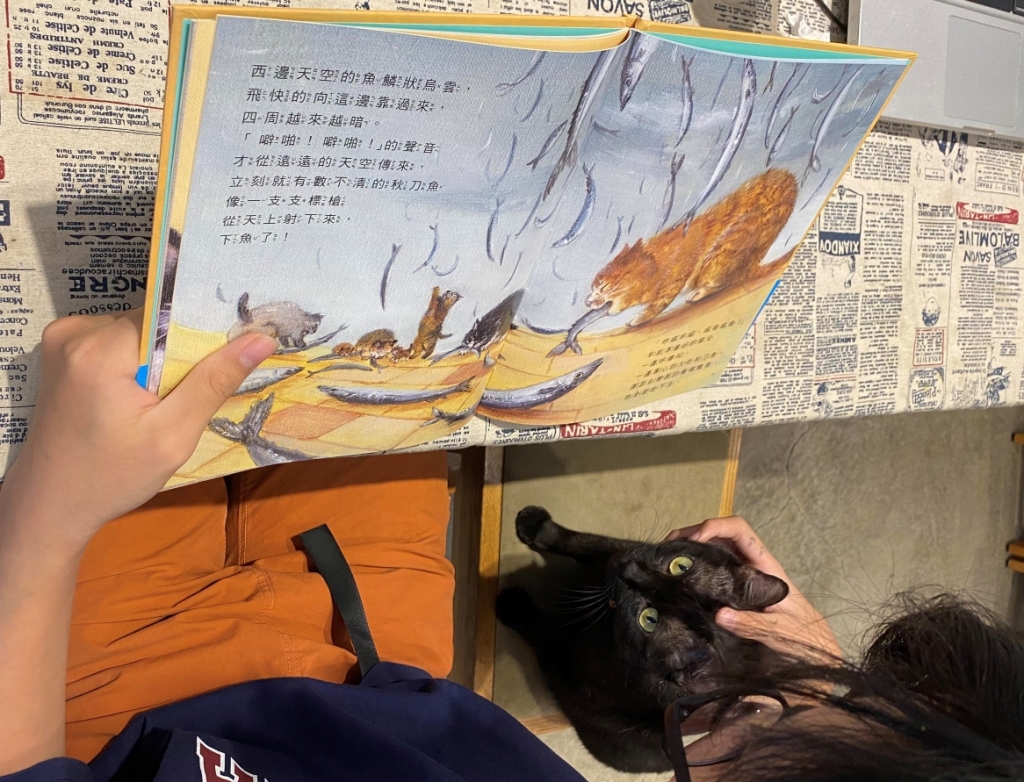 看到最後度假中的魚兒們騰空飛起,「乘著如浪濤的白雲,向大海游去。」這畫面真是又美又奇怪啊~讓我想到另一本書《小偷貓老大》,我很喜歡書裡的主角貓老大,他是一個很有禮貌的小偷,偷魚前會先跟魚攤老闆打招呼,也不貪心,一次只偷一隻秋刀魚,聽到老闆困擾抱怨氣象報告要下秋刀魚雨,他很講義氣的召集貓柳幫的兄弟們幫忙,把從天而降的秋刀魚,全部吞進肚子裡,從天而降的秋刀魚這個畫面真是太震撼了,我趕緊找來宅宅一起看,這對牠們貓咪來說應該是美夢成真吧!?牠一定很羨慕貓柳幫可以住在會下秋刀魚的小鎮!