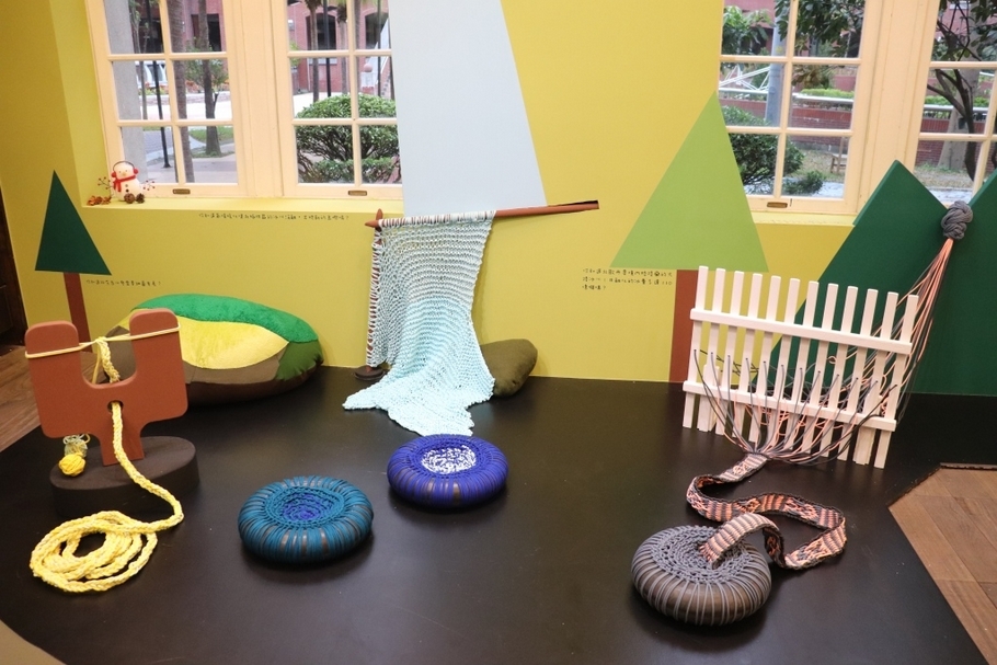 在U12空間裡,映入眼簾的是將自然意象結合的放大版編織創意,樹木化身為紡錘與繩編工具,柵欄成了北歐織帶的木筘,搓洗氈化的羊毛搖身變成孕育菇菌的綠化屋頂,橡膠輪胎與布條鉤織出冰河融化的湖泊海水,置身其中彷如充滿活力的小精靈們,正忙著替大自然編織出山河野原。