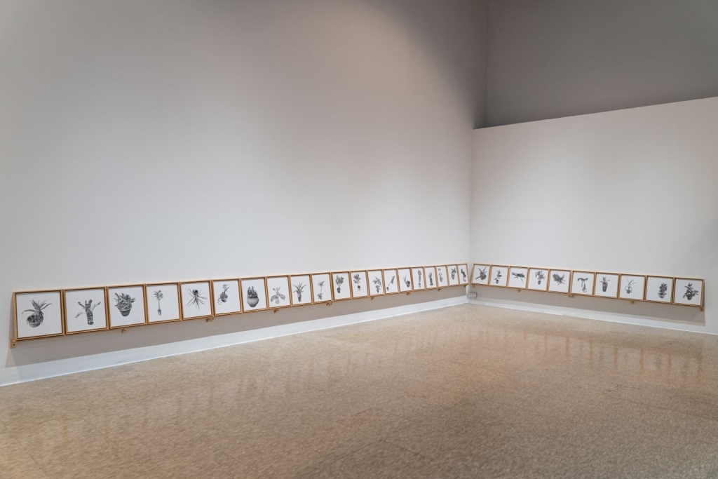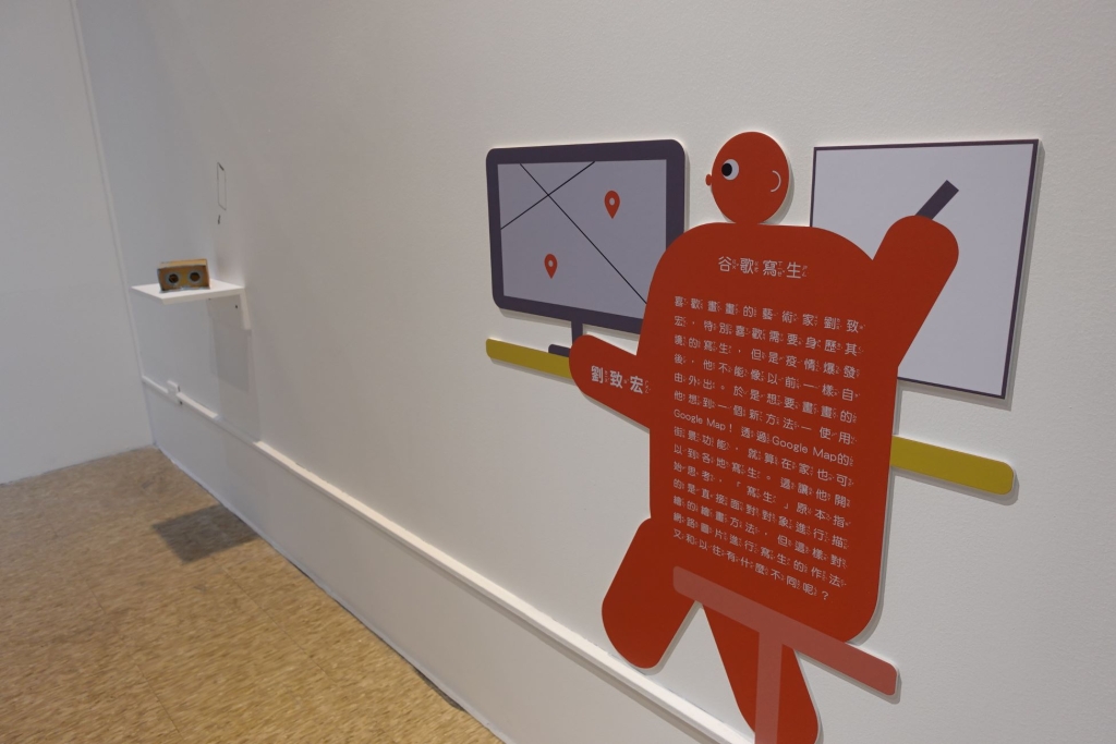 「谷歌寫生」是疫情期間關在家突發奇想,藝術家劉致宏用紙箱改裝VR眼鏡,讓不能外出的時候也能在家寫生。「盆栽」是日常生活常見路邊的各種植栽,平常在路邊拿來當路擋或三角錐,出現在美術館會覺得很奇怪嗎?或是在這之前也沒有留意過呢?