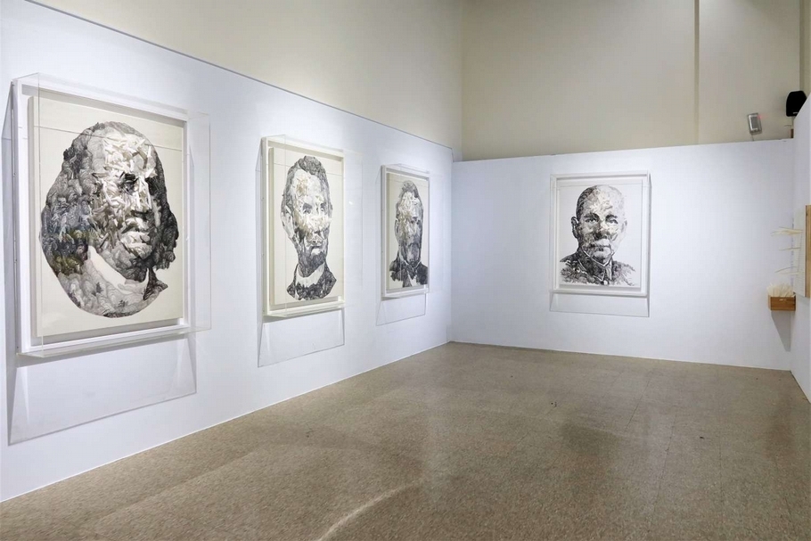 藝術家游文富以羽毛融合中國山水創作各國名人肖像。他自創作中摸索、探討自我的存在性,從過去到當下,甚而至未來的想望,揉合出生命的意志。(圖片來源:沃沃美學)