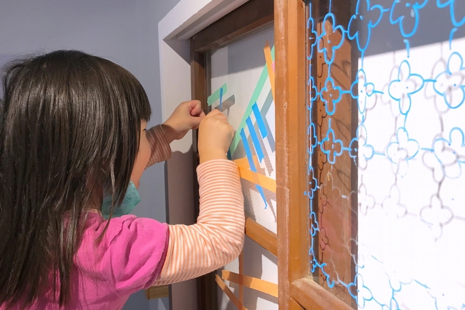 藝術家吳芊頤以紙膠帶拼貼臺灣的老窗花與窗外景色,孩子也可以在老窗上彩繪或拼貼出記憶中的老窗景。(圖片來源:沃沃美學)