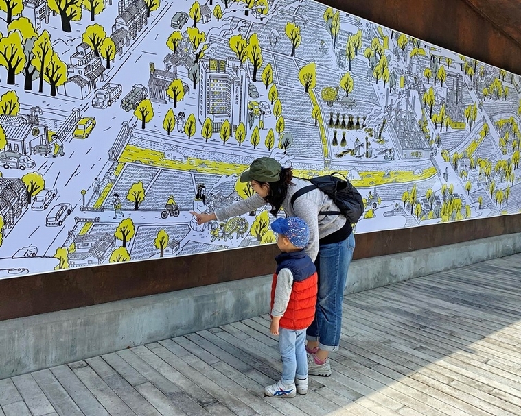 透過藝術家Croter Hung當代插畫繪製與細節呈現,帶著大家回憶草悟道過去的美好年代,感受現在的創意生活,構築未來的綠意城市。草悟道「過去」曾是一片麻黃田,溪流灌溉、農民農忙時的純樸風景;到「現在」則是充滿了文藝氣息與綠活休閒的城市綠帶;下一步往我們心中的美好烏托邦前進,「未來」世界是充滿大地綠意,原本藏到地下的溪流河水,也可再度成為城市景色的一部分,更是人類與動植物共生的未來世界。