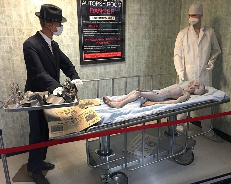時間回溯到73年前,1947年的7月,半乾燥氣候的羅斯威爾市下了場罕見的大雷雨,雷雨交加的夜晚,有個不明物體墜毀在平原上,附近農場的主人聽到巨大的聲響,懷著恐懼和好奇心前往一窺究竟,他發現了許多特殊金屬碎片散落在農地上,接著輾轉交給美國軍方。過了幾天,另一位市民向眾人聲稱見到一架嚴重受損的碟形物,旁邊還躺著幾具屍體。他仔細地描繪那些屍體沒有頭髮,有著大頭、大眼、小嘴巴,並且統一穿著灰色連身衣,如同館內的這些外星人一般。
