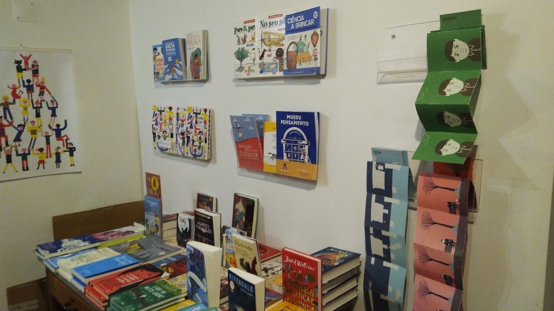 這不是一間只賣視覺作品或繪本的書店,但一進書店,進入眼簾的,是葡萄牙幾家繪本出版社繪者出版的藝術書。空間上的設計非常有心,主要空間是綜合類型的書品,然後我們會走進一條走廊,進到洞穴(小房間),洞穴裡放滿了玩具和童書。