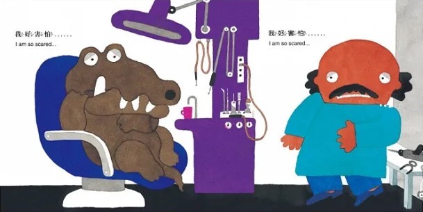 兩歲的侄兒有一天走進我房間,自己從書架上拿了《鱷魚怕怕牙醫怕怕》坐在床上翻讀著: