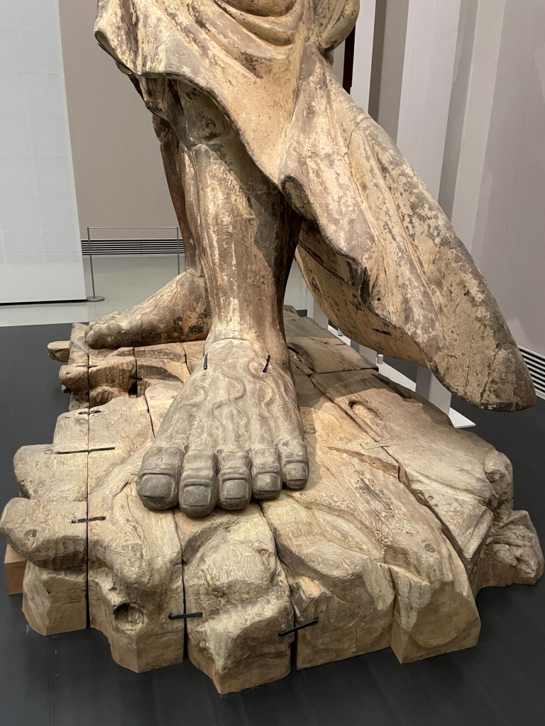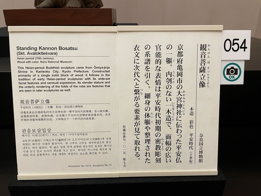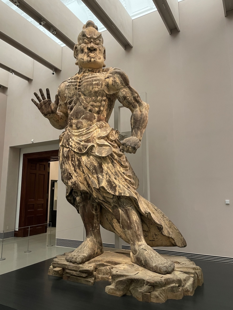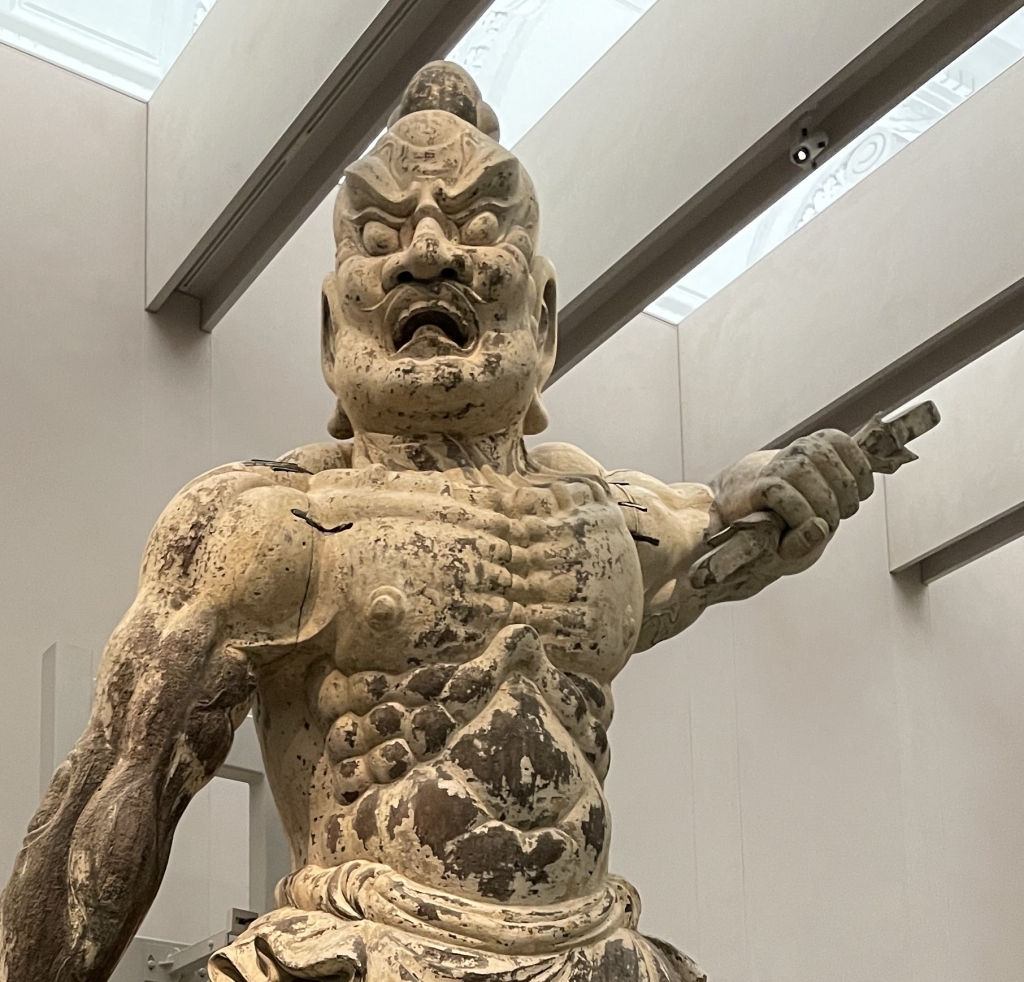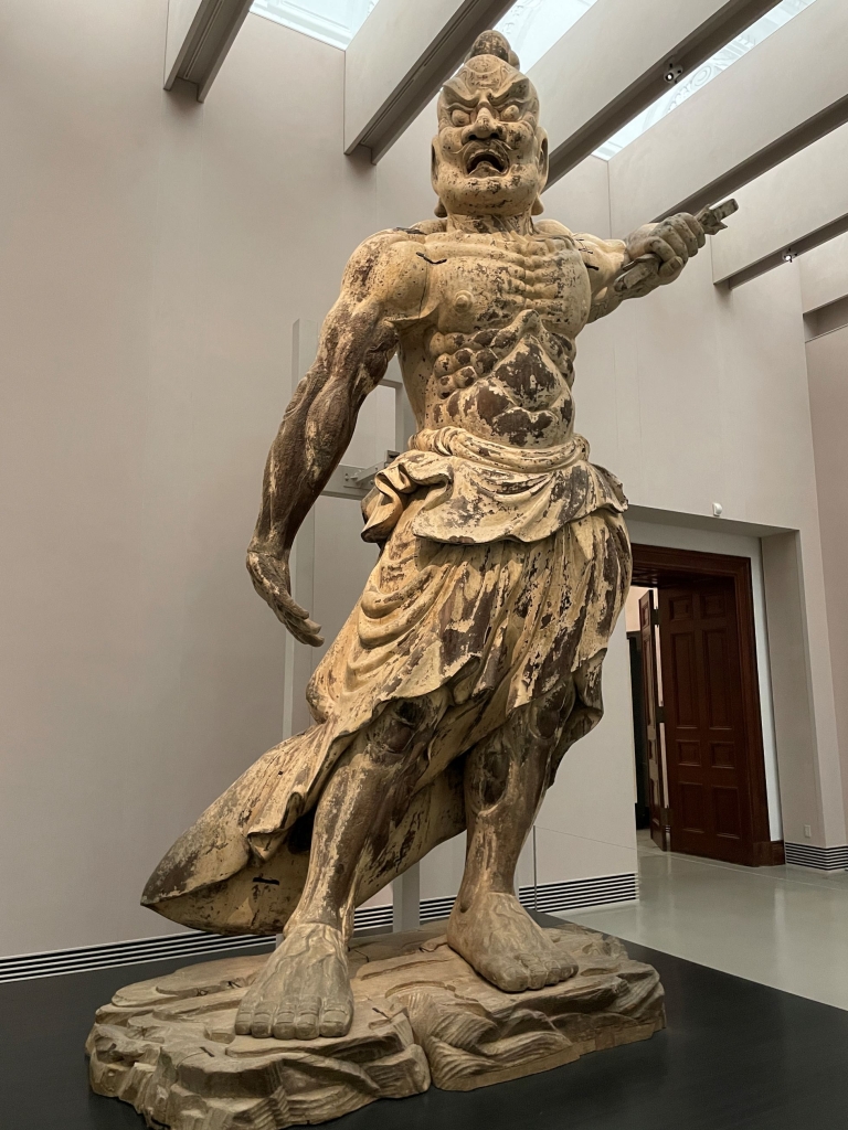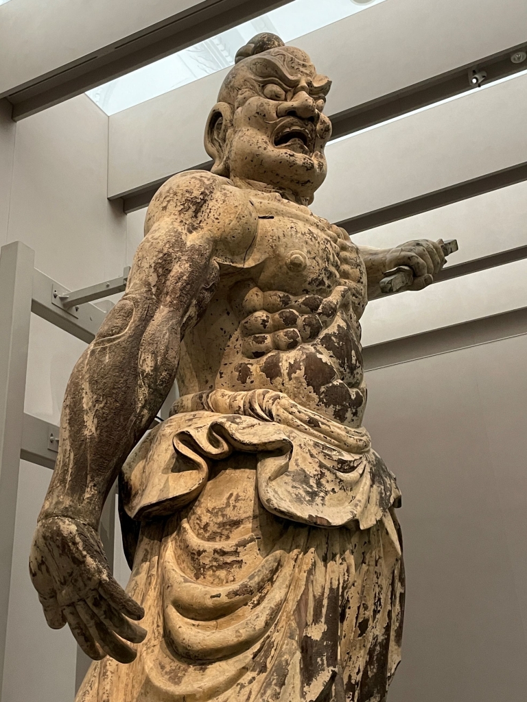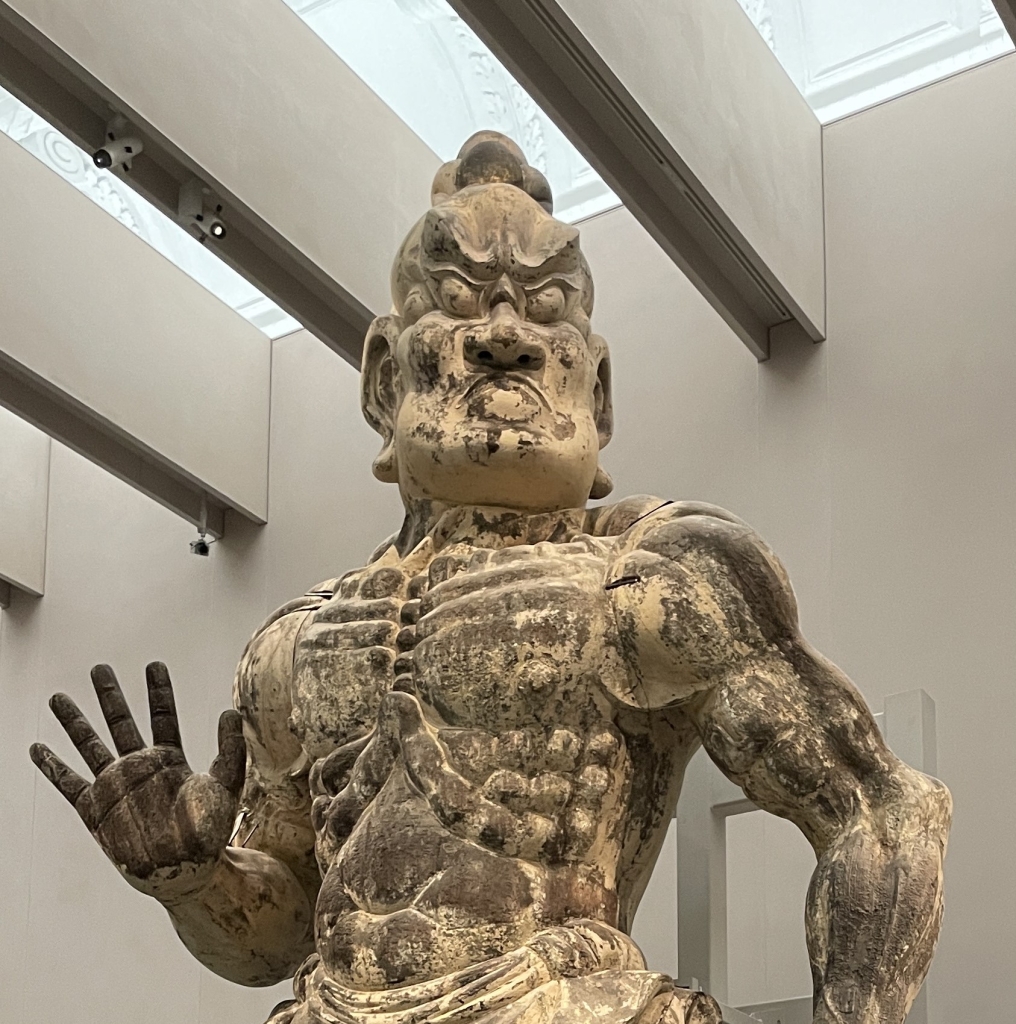 走進博物館,可以看到非常多樣、歷史悠久、神情與大小各異的佛像、神像。例如,展廳中央這兩尊巨大的金剛力士立像。嚇!這是館內最大的神像,祂們擁有約5公尺極高又壯碩的身形,頭頂都快碰到天花板了!雙腿雙臂佈滿強健的肌肉線條、腹部十分結實,看起來超越八塊肌!祂們的下半身圍著一件稱作「裳」的布料,工藝師在裳上刻畫的紋理與皺褶,讓我覺得祂們更威風凜凜了!