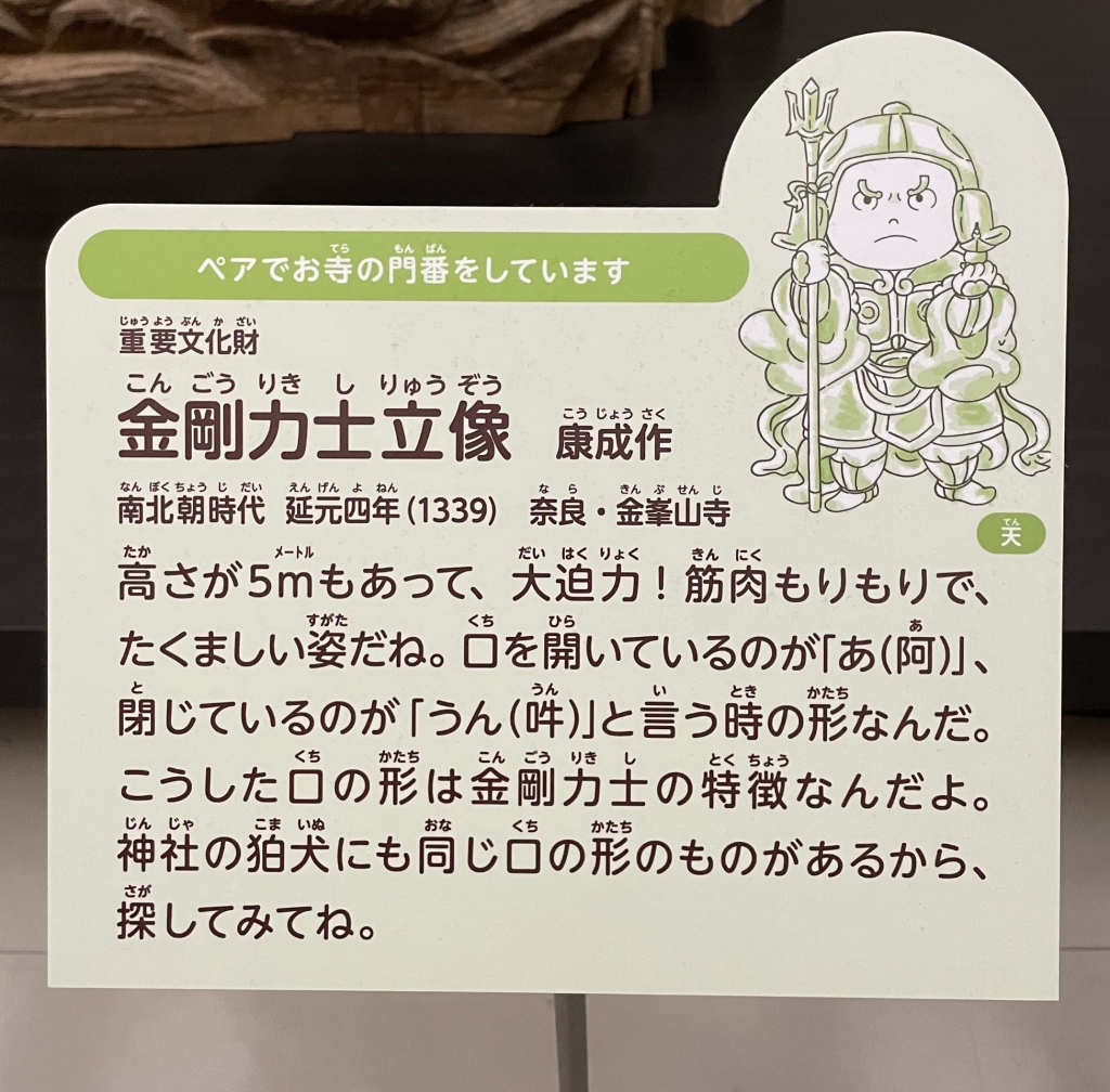 這兩尊巨型金剛力士立像的體型算是目前日本第二大,分別於1338年、1339年被雕塑完成,原先被供奉在奈良金峰山寺仁王門,因2018年仁王門整修,被運送到奈良國立博物館進行修復、保護,光是運送、定位、組裝就花了兩個月,可以想見其工程浩大。且,為了讓佛像不受地震影響而倒塌,館方在神像下方增設黑色的隔震底座及神像後背處用白色的支撐支架,相當用心!