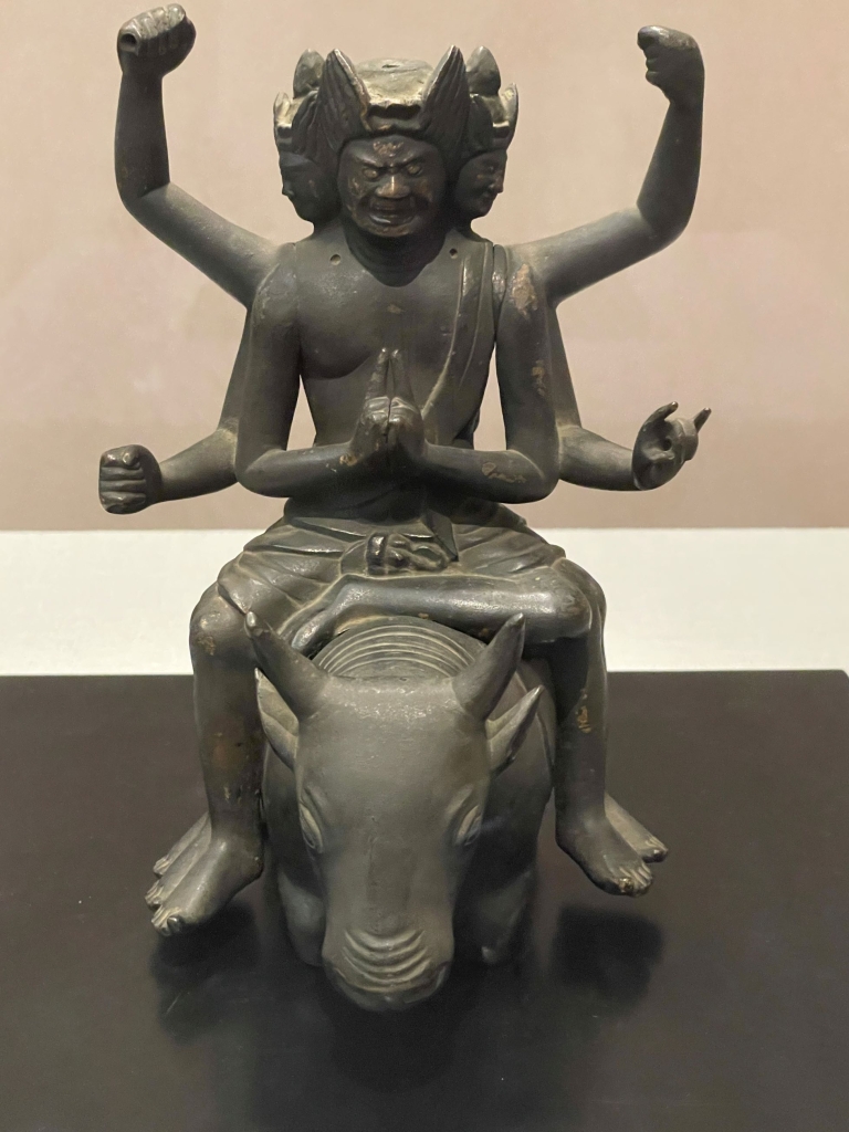 雖然我們一般看到的如來或菩薩都是眉清目秀、仁慈安詳,不過現在你眼前的這尊大威德明王不同!祂有三頭、六臂、六足,坐在四肢跪地的牛身上,正面的那張臉跟金剛力士相仿,都是皺緊眉頭、怒目的型態。按照佛教的說法,大威德明王是憤怒相的阿彌陀如來或文殊菩薩,為了降伏妖魔鬼怪,所以看起來比較兇!不過,奈良國立博物館收藏的這尊大威德明王騎牛像是平安時代後期,人們為了祈禱戰爭勝利而被製作出來,所以是不是因為這個原因,這尊佛像兩側的臉是面露微笑,加上兩隻手臂高舉,好似在慶祝呢?