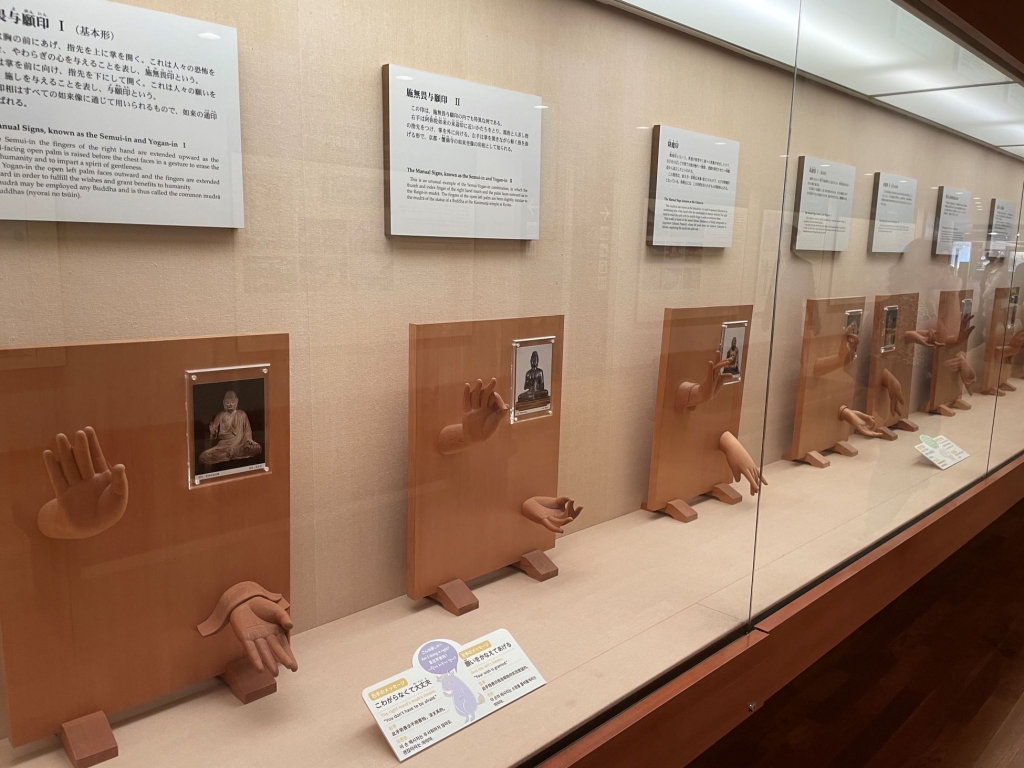 剛剛我們欣賞的阿彌陀如來坐像,祂的手印是「定印」,為禪定時使用的手勢,但不同如來像都有各自的手印,及其象徵涵義!大家參觀時可以根據這一塊塊手印模型細細研究,而且館方還有特別為兒童製作說明版!