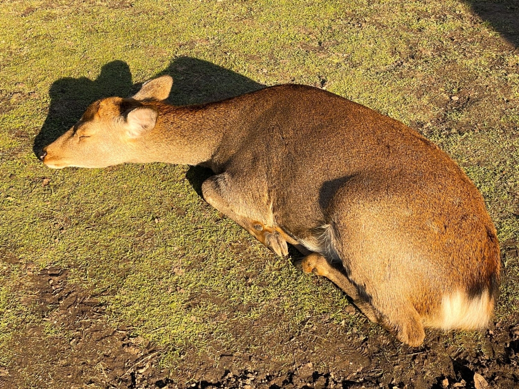 好可愛呀!!發現躺在草地上睡覺的褐色小鹿!!就算被刺眼的陽光照射,也敵不過睡意,依舊緊閉著雙眼呢!