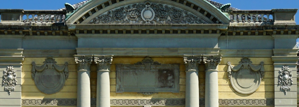 跟著小鹿來到博物館的後門,咦?這棟灰色、米黃色,典雅的建築怎麼不太有日式風格?印象中傳統的日式風格應該是木造建築、色系以咖啡色為主、黑瓦屋頂、有走廊、庭院景觀等。但這棟建築看起來是水泥或石造,屋頂雖然也有黑瓦,但又增添許多裝飾,看起來比較方正,且整體結構相當對稱,有許多柱式,如拱門兩側圓柱體、長方體的柱子。再仔細看一點,柱子上方還有許多繁複花葉的浮雕,山牆上也有一朵朵花卉、蜷曲捲葉,以及類似勳章紋飾的華麗雕刻。