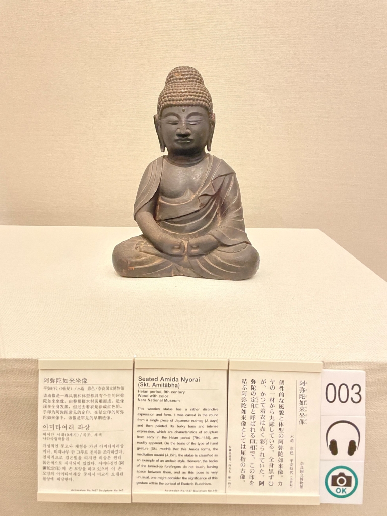 接著,我們一起來看看面色慈祥的阿彌陀如來坐像收收驚?!這尊是9世紀平安時期的造像,有著典型、釋迦般的螺髮,以及高高地「肉髻」,這可不是「包包頭」髮型!而是智慧的象徵!據說肉髻越高,代表越有智慧!再來,看到如來像眉心中央的圓點了嗎?它可不是痣或是裝飾的珠子,而是「白毫」!它是類似一種捲曲的白毛,相傳如果打開會發出萬丈光芒,照耀眾生,是修行很好的人才會出現的面向!最後,此尊如來坐像全身沒有配戴其他裝飾,僅披著袈裟,雙腿盤坐,閉目養神、嘴唇抿成一條線,像是靜靜地沉思,卻有一種莊嚴的氛圍。