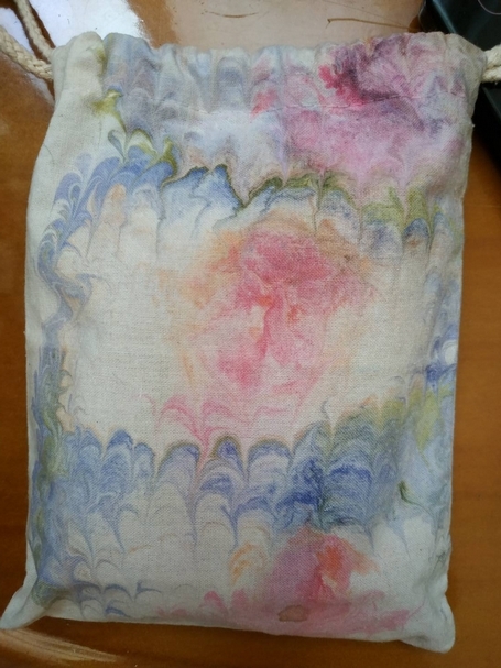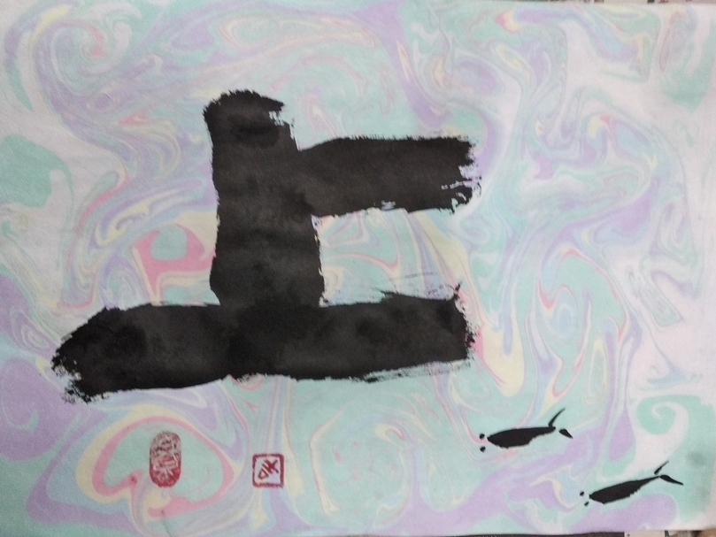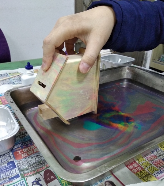 十多年前在就讀研究所的課程中接觸浮水染技法,先將顏料依序滴入水中,再用尖狀物畫出圖案,平放宣紙,數秒後拿起宣紙晾乾,依情境加上書畫及蓋上印章,即完成一張精彩作品。下圖為一大班男生的作品: