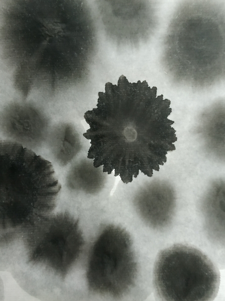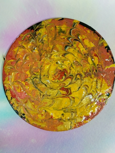 因為浮水染的教學經驗,所以想了個小小實驗,不加助流劑而改用酒精,取一紙杯墊,先上一層黑色壓克力顏料,再將調了酒精的各色壓克力顏料倒入,加以流動後完成。