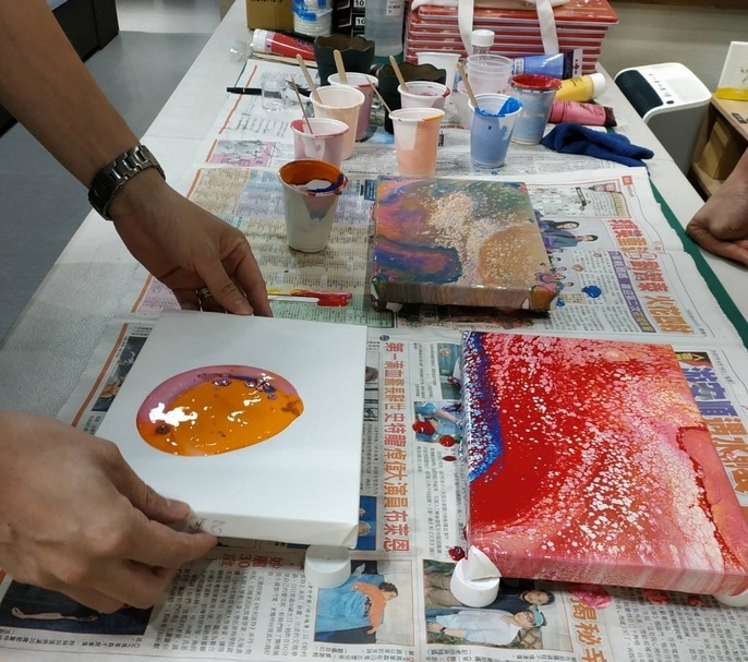日前,因為教學路過捷運中山站旁的六號藝文,剛好店內在示範流體畫作,先將畫板利用四個小瓶蓋架空在桌面上,然後將數個壓克力顏料調了水及助流劑分裝在不同的紙杯內,最後依序倒入另一個空的杯內,再倒扣在畫板上,靜置數秒後拿開空紙杯,再慢慢利用流動來調整畫板上的顏料,待乾後即完成一張精彩的作品。