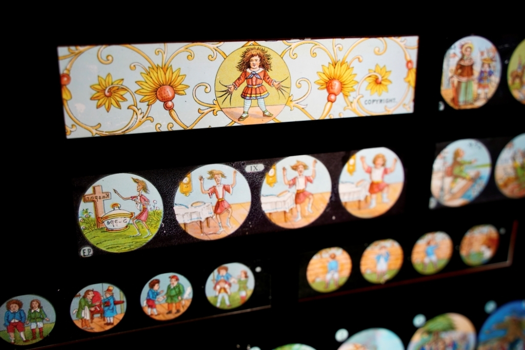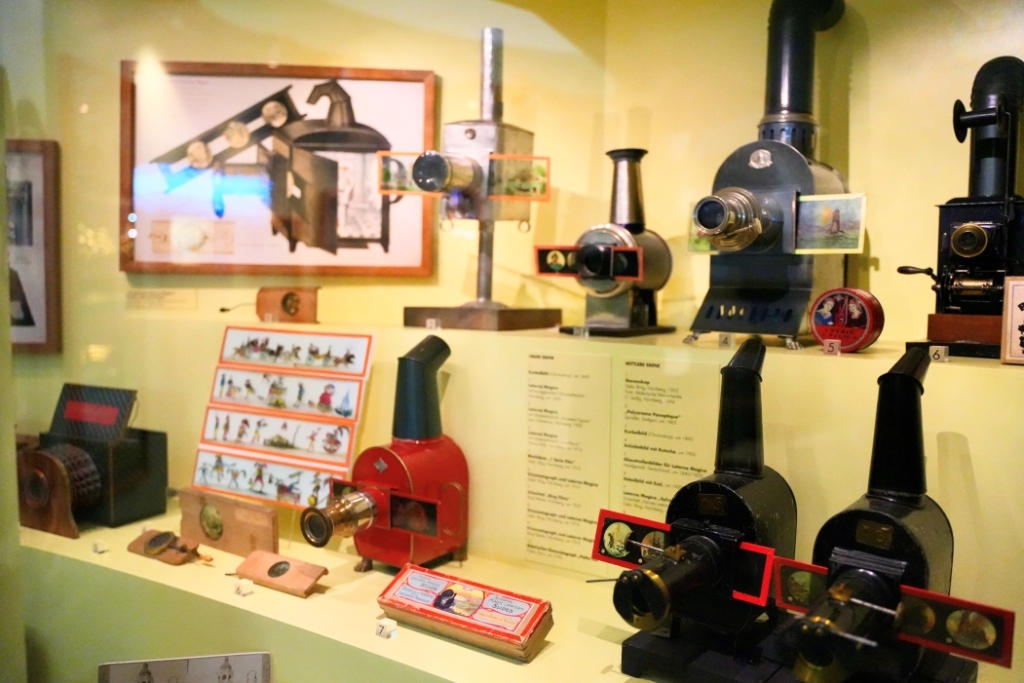 在光學玩具專區則展示窺視盒(Guckkasten)、幻彩燈(Laterna magica)、立體鏡(Stereoskopie)等在 17~19 世紀於歐洲廣為盛行的影像傳播媒體。