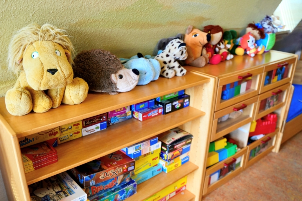 最上層的閣樓分成兩大區域,第一個區域是遊戲空間,這裡有大量的積木、桌遊和玩具。櫃子上的玩偶收藏不僅有德國知名的卡通角色「橘色老鼠」,也有來自日本動畫妖怪手錶裡的「吉胖喵」。