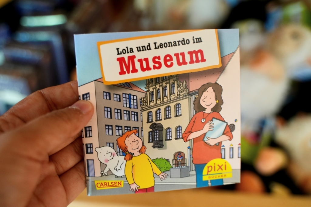 回到博物館的一樓,我在小小的商品販售區中挖到一個有趣的小寶藏,Pixi-Books(Pixi-Bücher))是卡爾森出版社在德國出版的書系,通常是以手掌大小的平裝本呈現,這系列的書以單價便宜、易於取得而聞名,不只書店有它的蹤影,連藥妝店、大型超市、車站的便利商店也能看見一個頭戴紅帽、身穿綠衣的小孩人偶捧著一個超大碗公,裡面擺著滿滿的平裝繪本。
