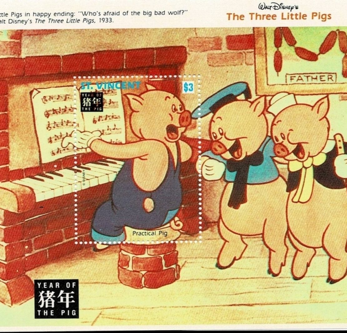 此郵票是聖文森特(Saint Vincent)為配合豬年於1995年1月24日所發行的小型張,主題為迪士尼於1933年發行的《三隻小豬》動畫中結尾一幕,亦即是三隻小豬趕走大壞狼後開心唱著「誰怕大壞狼?」(who’s afraid of the wolf?)的經典畫面。