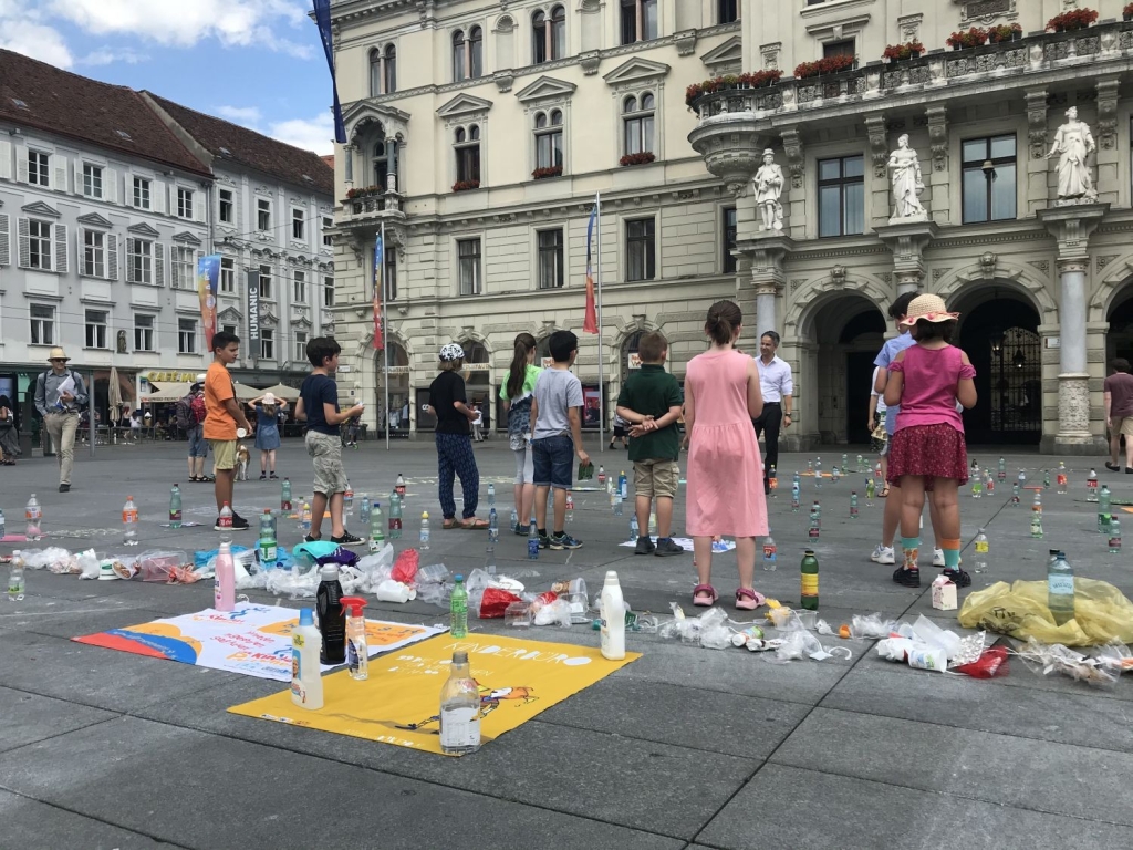 為了引起民眾對塑膠問題的關注,兒童議會的成員們在格拉茲的主廣場上放置了許多塑膠瓶和其他塑膠垃圾,並製作傳單向來往的民眾分發宣傳理念。三位格拉茲市的成人市議員也來到了現場,支持兒童議會的活動,兒童們用具體行動表達自己對環境以及對地球未來的關懷,得到了許多民眾的支持與迴響。