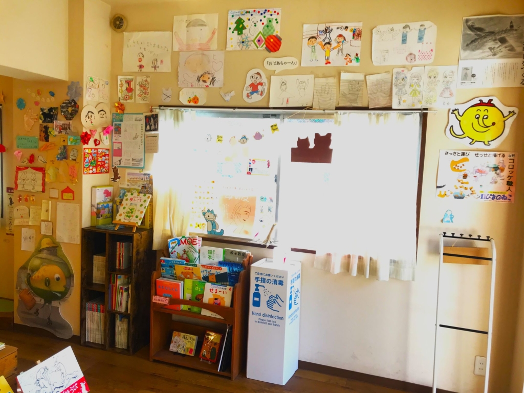 櫃子上擺著琳瑯滿目的繪本玩偶或小裝飾品,四周牆壁上則貼滿了各種摺紙、童書主角的插畫、孩子的作品。