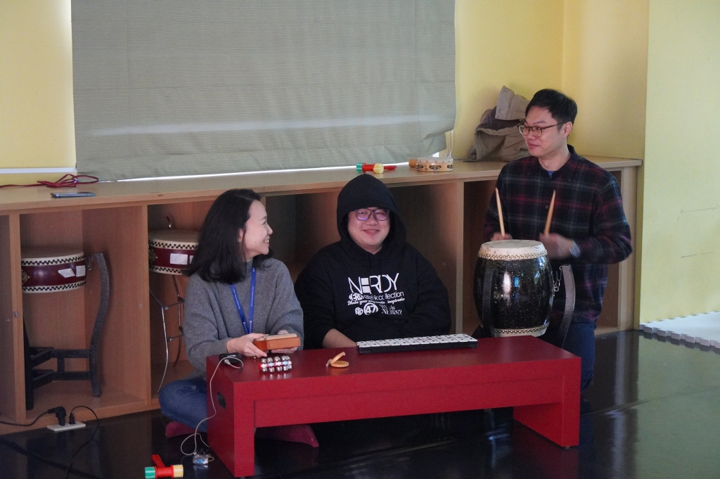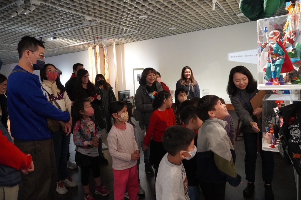 台北偶戲館的⼯作⼈員們,在活動的初始,安排了⼀場專業的當代布袋戲偶導覽。孩⼦們對於客家戲偶相當好奇,無論是融合搖滾元素、或是漫畫的靈感採集,都引領他們對偶的多元,產⽣許多天⾺⾏空的想像。「這些娃娃和平常玩得好不⼀樣喔!」、「它的衣服好華麗啊!」讚歎聲從許多孩⼦的⼝中⾃然⽽然地流竄出來。