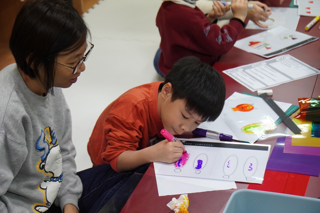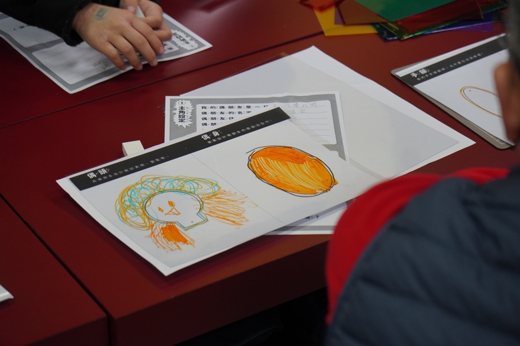 聽完故事後,參加的親⼦組合可以根據⼀份引導單,開始發想⾃⼰與故事中偶的關聯,設計屬於⾃⼰來到偶戲館的故事。家長們負責製作場景、孩⼦們則製作光影偶。透過繪製⼈偶、連接能操縱的關節,孩⼦們也開始相互討論,並⾃⾏採排起預計想訴說的故事。透過⾃製的偶,孩⼦揉合了想像與⼼事,或許是說⼀段開⼼的往事、也或許提及了⽇常的煩惱,家長們也在共創故事的過程裡,多瞭解了孩⼦⼩⼩腦袋裡的⼤⼤世界。