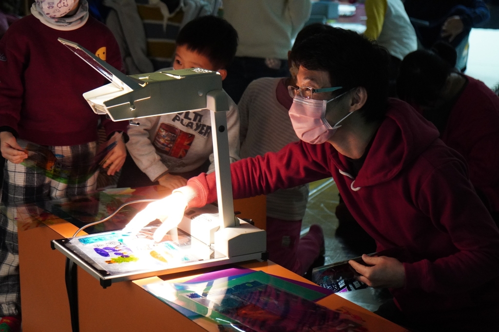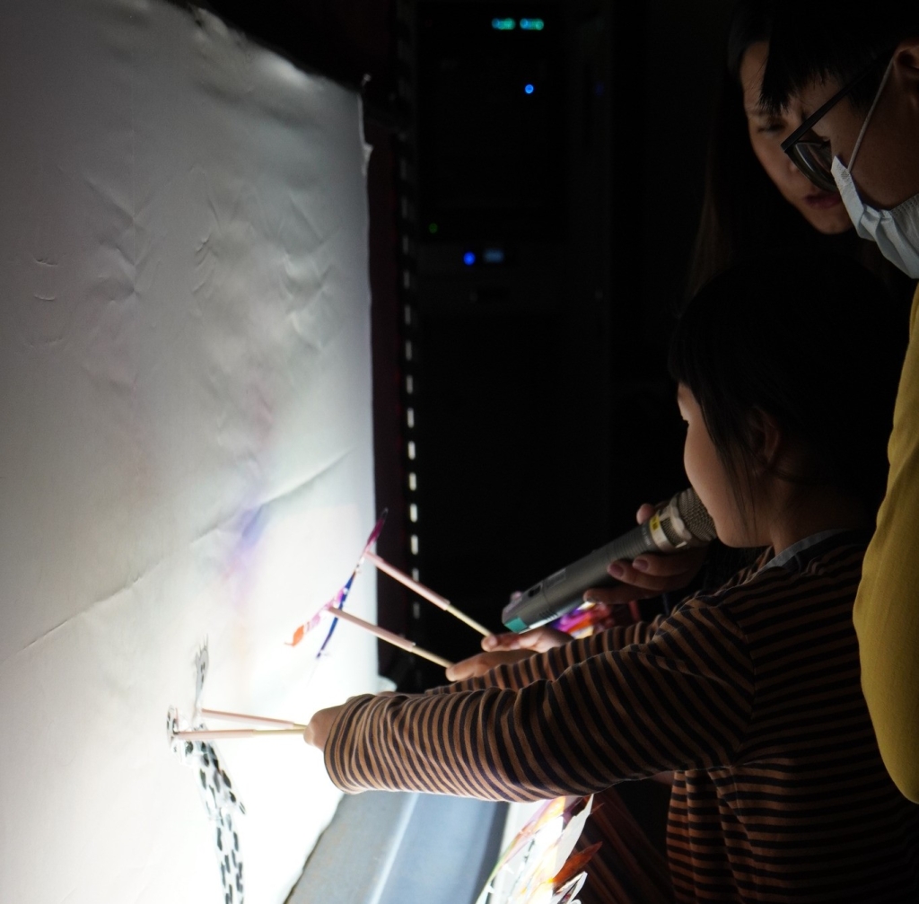 孩⼦們完成光影偶後,陸續踴躍上台分享⾃⼰的偶戲。原本擔⼼孩⼦會因為緊張或害羞拒絕分享,但或許正是光影偶的特性,孩⼦們化⾝為⼩⼩操偶師,在布幕後⽅表演相當隱蔽且安全,透過扭動偶的關節產⽣動作,搭配著變換的場景,想像⼒就是超能⼒,或許我們與偶,並沒有太⼤的區別?