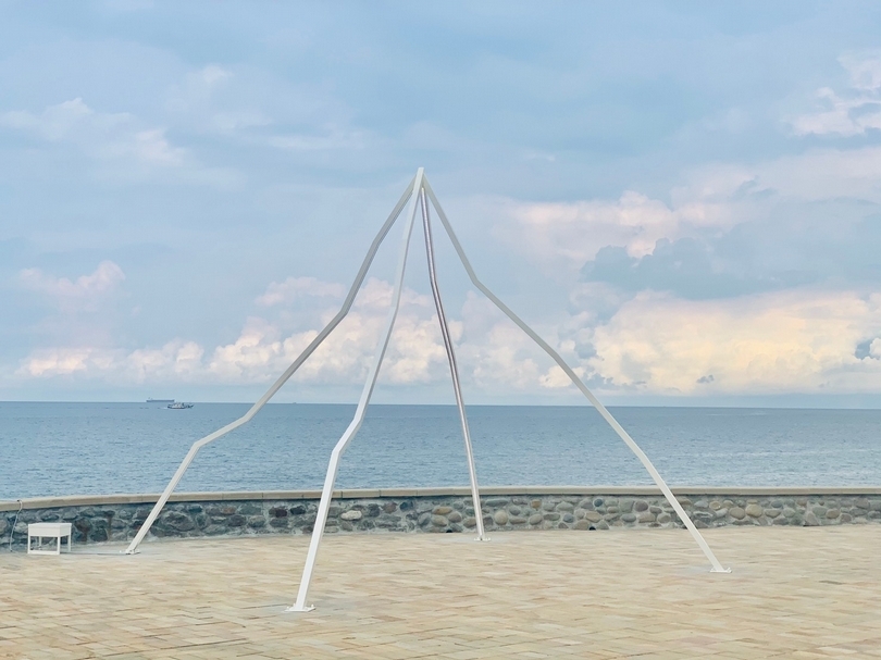 藝術家羅景中作品《山》,簡單的線條,在藍天白雲襯托之下,顯得清新脫俗。