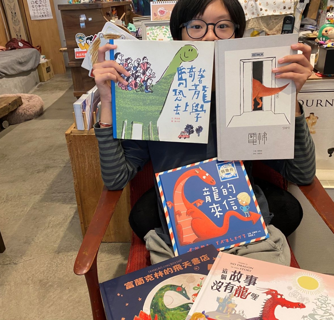 看小雷龍愛聽故事時,我就會想到另一隻愛看書的龍,他來自《富蘭克林的飛天書店》,我在剛成為書店闆寶時認識了這隻名為富蘭克林的龍,就覺得我們一定會成為氣味相投的好朋友,真是相見恨晚啊!他已經在故事裡與紅髮小女孩露娜開了一家書店,而且是「飛天書店」,看著他們和書店的讀者們夜空中乘風飛翔,一起在月光下享受閱讀的美好,真是讓人羨慕嚮往!我和媽媽都很喜歡這本書的作者珍・坎貝爾,她在英國也曾經擔任過多年的書店店員,是一個很愛很愛書的作家,如果你們也喜歡這隻愛看書的龍,請一定也要讀讀坎貝爾創作的《富蘭克林闖進童話書》和《書店怪問》。