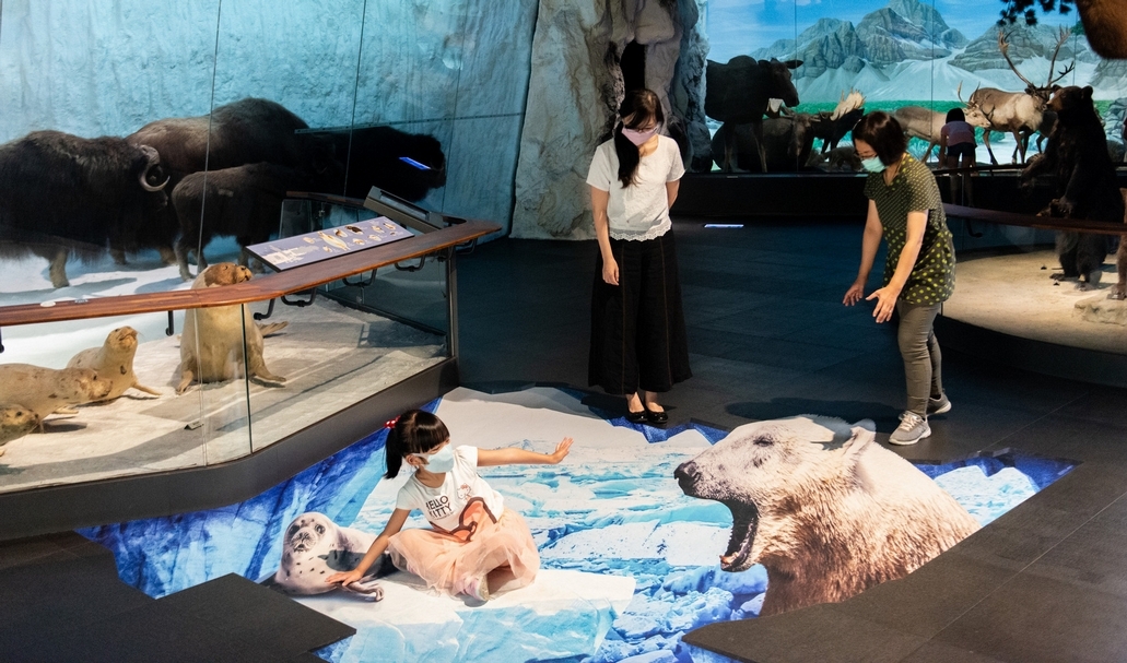 另一場景是「北極熊覓食」,由於全球暖化造成冰層融化,危及動物生存,此場景呈現出北極熊想獵捕菱紋海豹的瞬間,遊客需要抉擇,究竟是要阻止北極熊、救下小海豹,還是要幫助可能因融冰而滅絕的北極熊獲取食物?歡迎大家發揮創意拍出最獨特的照片。館方指出,有趣的地景不但滿足遊客拍照打卡的需求,也期盼藉此使民眾了解動物習性及自然生態。