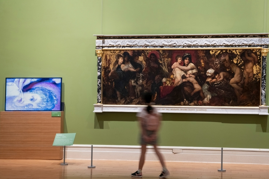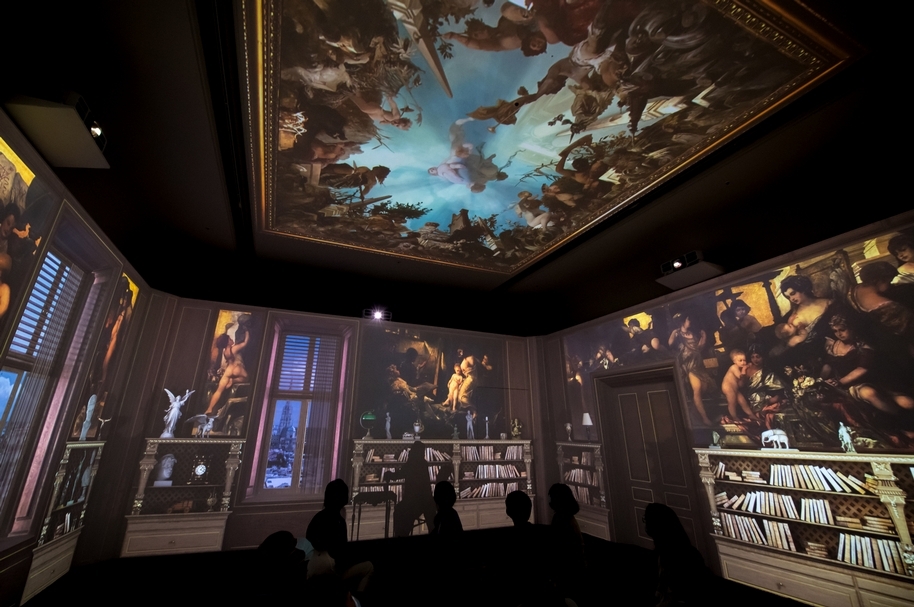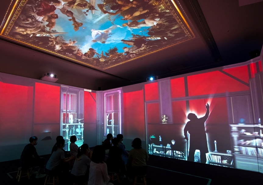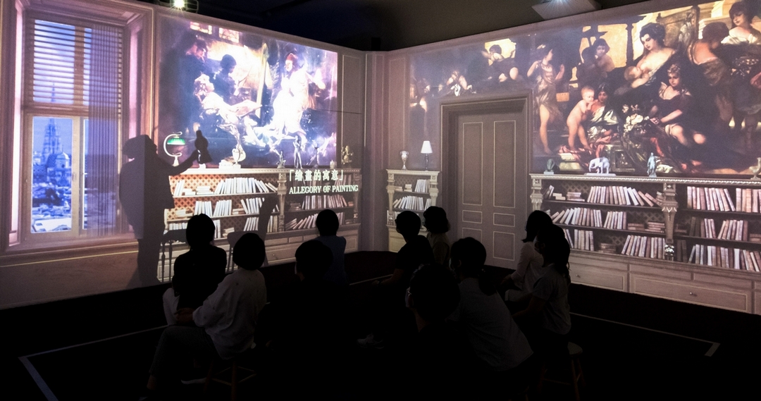 「藝術廳」推出全新展區「時間的房間」,以畫作〈音樂的寓意〉為主題,打造一個環繞式多媒體影音空間,透過天花板與四面牆360度的投影,讓民眾穿越逾百年的時空,回到畫作誕生之際,一路跟隨畫家、畫作委託人與作品自身的獨白,了解畫作顛沛流離的歷程。