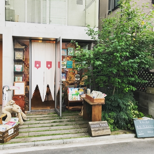 脫離了熱鬧的主幹道,拐個彎走進進閑靜小巷,當你開始懷疑這裡是否有店家的時候,一眼瞥見了一塊木板上寫著:繪本古書店,後頭的樹遮住了店門口,只能看到幾個木架子和小黑板。轉到正面之後才得以窺見全貌。除了一般繪本古書店門口都有的促銷平裝繪本,MAIN TENT的招牌標誌就是趴在門口的大小獅子玩偶。掀開彷彿旗子的門簾,店內兩側從天花板到地面都擺滿了繪本,中央懸掛了兩片布幔,配上復古華麗的燈飾,整個空間宛如一座舞台。在書架間裝飾著許多小物件,據說這些都是店長收集長達20年以上的嚴選裝飾,包含門口的大小獅子,店內許多動物玩偶都還有自己的名字和人物設定。牆上充滿奇幻氛圍的圖畫,則是來自和妹妹聯手組成的「打開暗夜之門的方法」的創作。